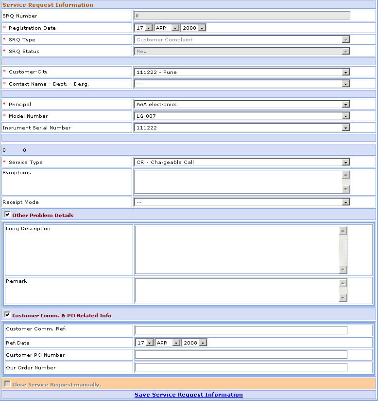2- Click on Save Service Request Information link to save Customer Complaint Service Request.