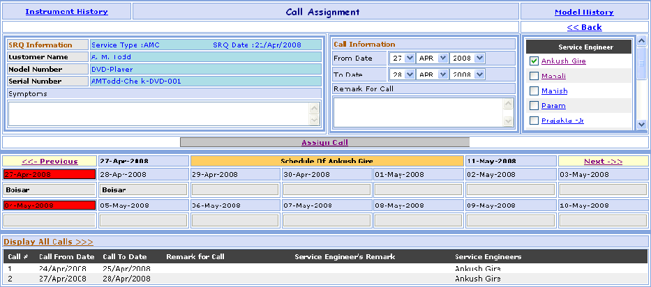 2- Click on Display All Calls >>> link, to display the all Calls of Manish Service Engineer.