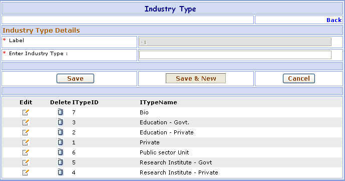 This page is used to enter the Industry Type in your database. You can Add, Modify, Delete the Type from this page.