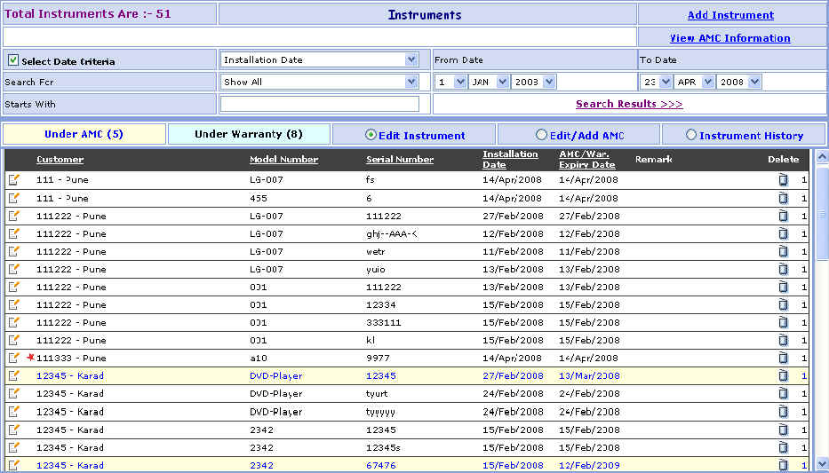 Main, Sub) Instrument Wise, (Installation, Warranty Expiry, AMC Expiry) Date