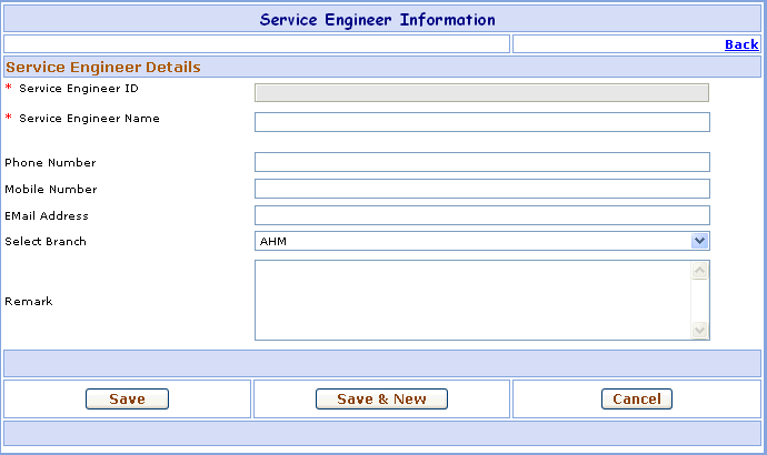 Click on Save & New button to Save the Service Engineer and clear all the fields to enter New Service Engineer.3- Click on Cancel button to Cancel the Service Engineer and clear all the fields to enter New Service Engineer.