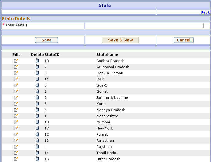 This page is used to enter the State in your database. You can Add, Modify, Delete the State from this page.